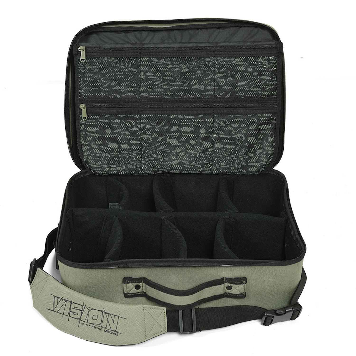Die Vision Hard Gear Bag - Diese Rollentasche ist eine echte Mehrzwecktasche für den begeisterten Fliegenfischer. Sie kann als geräumige Rollentasche verwendet werden und bietet Platz für eine große Anzahl unterschiedlich großer Fliegenrollen. Dank ihres genialen Innenwandsystems können Sie sie jedoch ganz nach Ihren Wünschen und Bedürfnissen umbauen.